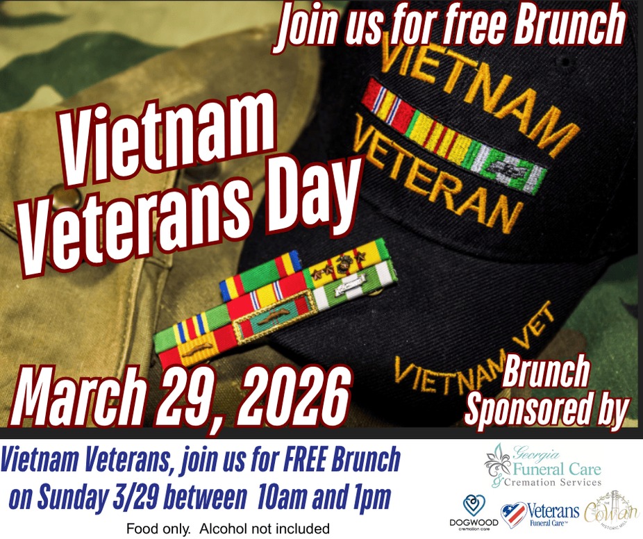 Welcome Home, Vietnam Veterans. Â Thank you for your service and sacrifice. Â Join us on Sunday, 3/29 for a free brunch sponsored by Kevin Marcy of Georgia Funeral Care.Â